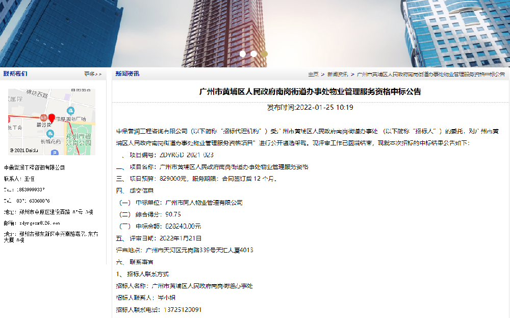 鼎點(diǎn)娛樂(lè)工程咨詢有限公司(以下簡(jiǎn)稱(chēng)“招標(biāo)代理機(jī)構(gòu)”)受廣州市黃埔區(qū)人民政府南崗街道辦事處 (以下簡(jiǎn)稱(chēng)“招標(biāo)人”)的委托,對(duì)廣州市黃埔區(qū)人民政府南崗街道辦事處物業(yè)管理服務(wù)資格項(xiàng)目”進(jìn)行公開(kāi)遴選采購(gòu)。現(xiàn)評(píng)審工作已圓滿結(jié)束,現(xiàn)就本次招標(biāo)的中標(biāo)結(jié)果公告如下:一、項(xiàng)目編號(hào):ZDYRGD-2021-023二、項(xiàng)目名[詳細(xì)]